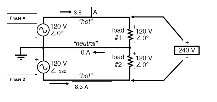Using vectors we would say the sum of the current in the neutral is 8.3Ð0Deg A (Phase A Current) + 8.3Ð180Deg A (Phase B Current).